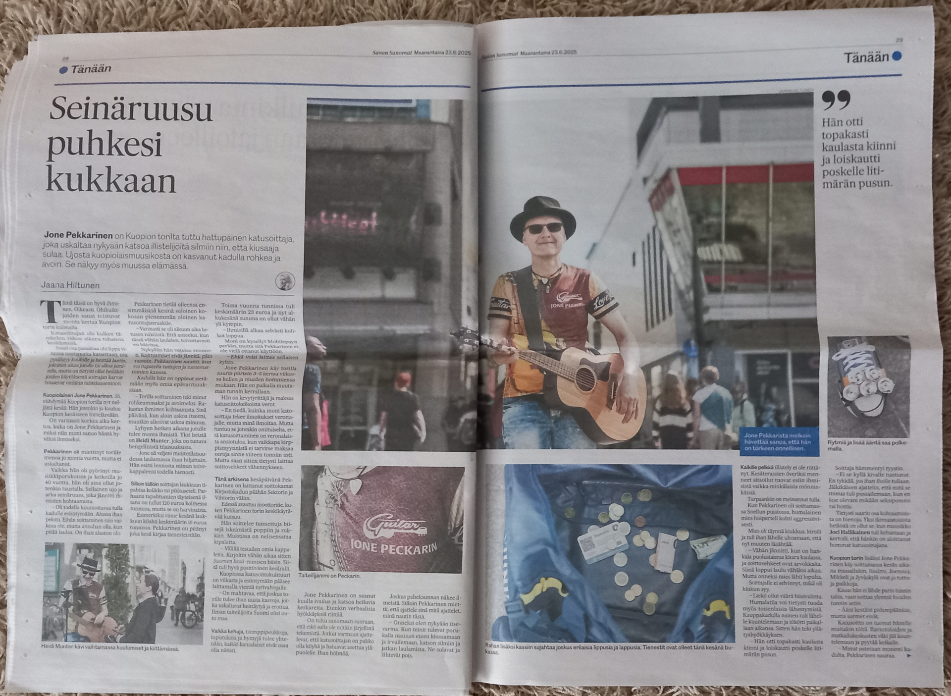 Alkukesä ollu keikkarintamalla sopivan kiireinen, muun muassa kuvassa kukkapusikon takana taiteilija joka jaksaa hymyillä Puijonlaakson kesänavauksen keikan jälkeen vaikka kyseisellä viikolla oli viimelopun hurjat 18 eri soittokeikkaa ja se on sellainen määrä keikkoja/vko että se on sitten kelle vaan ammattimuusikko kollegalle mallia paljon ja vähän päälle! Kaupunkilaiset alkaneet tunnistaa minut musiikin ulkopuolella mitä ihmeellisimmissä paikoissa ja tulevat juttusille rohkeasti. Viikonloppuna Pyörön torilla tuntematon mies tokaisi ohi mennessään. "Hei, veditpä tuossa äsken Finlandian paljon paremmin kuin Kuosmanen." Tiedän vaan sen että kun Finlandian jättänyt jo pitkään keikoillani viimeiseksi biisiksi ja on esitykseni kruununjalokivi koska tunnen ja osaan sen satojen esityskertojen jälkeen hyvin. Sanat lämmittivät mieltä, tottakai jos valtakunnan viralliseen Finlandian esittäjään (Saku Kuosmaseen) noin verrattiin. Tästä on hyvä jatkaa kesää ja musisointia monessa eri kohteessa vankiloista,toreille jne..